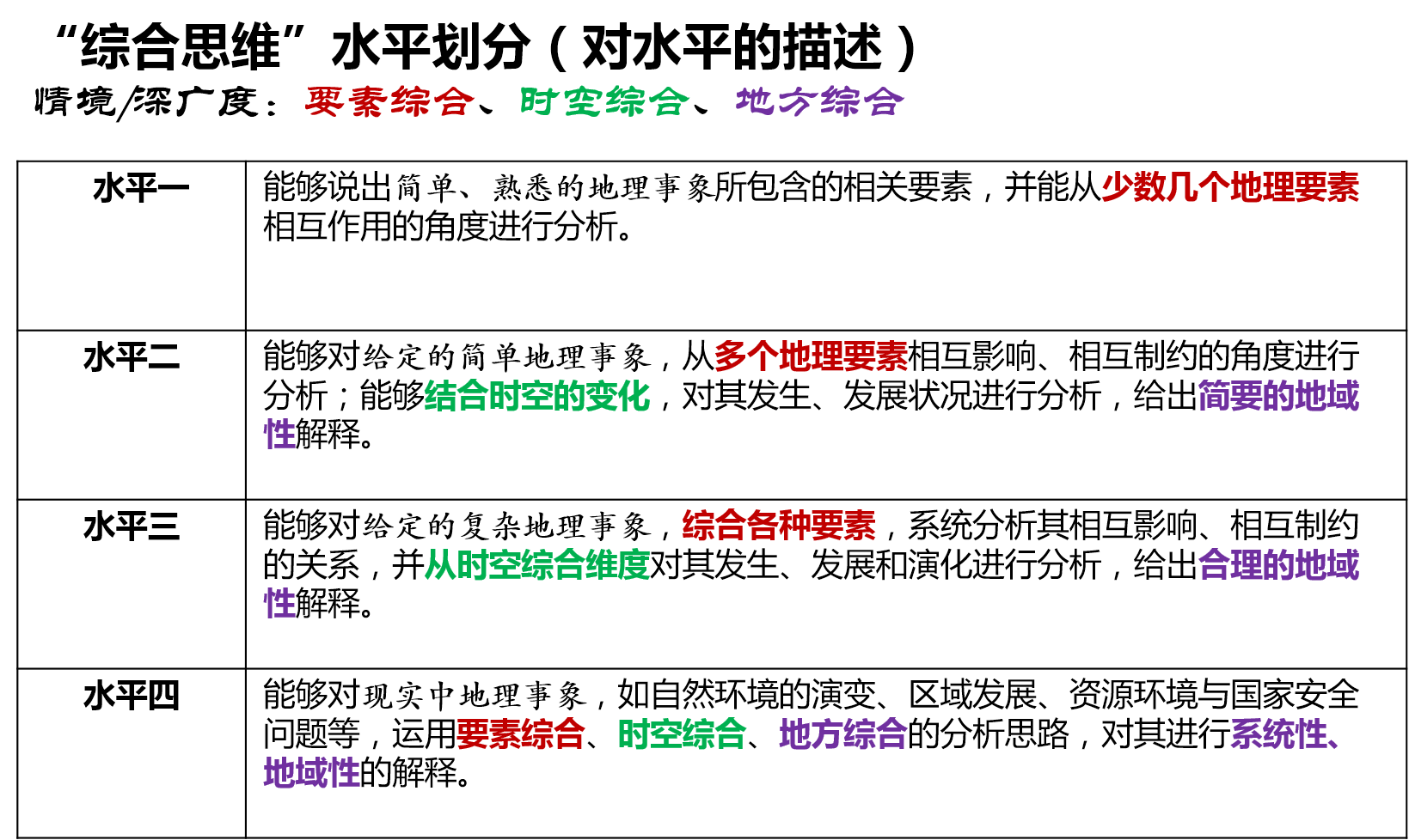 培养和训练学生的综合思维,旨在使学生能够多要素、多角度,而非孤立、绝对、静止地分析地理事物和现象;能够辩证地,而非僵化地分析人地关系问题。